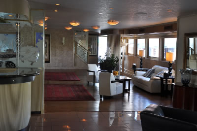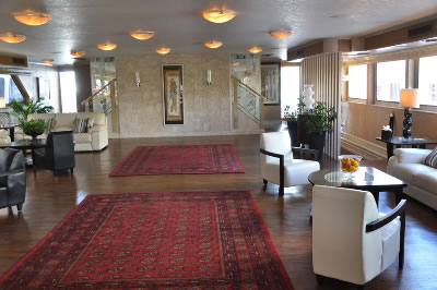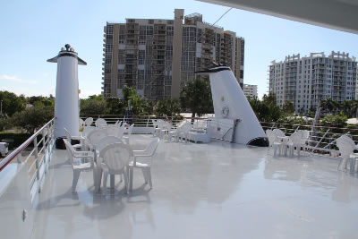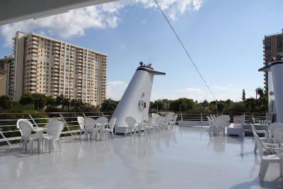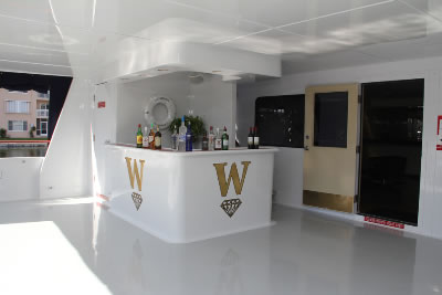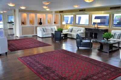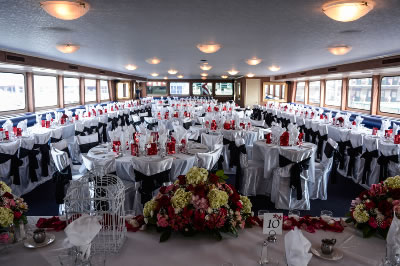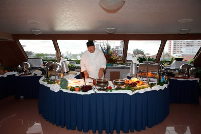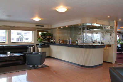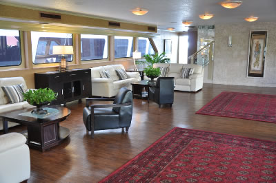 Lady Windridge features four levels including staterooms / restrooms on the lowest level, an expansive lounge decorated with finely appointed furnishings on the main deck, a large dining salon for up to 240 seated guests on the third level and a partially enclosed top level bar and open air skylounge.