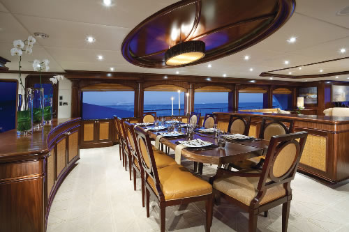 The 164-foot Yacht Wheels is available for charter to the Florida Keys, where guests can enjoy a tropical vacation in complete luxury. This custom-built Trinity Yacht will turn heads with her stunning exterior and her custom-designed interior, developed by Scott Carpenter, is simple yet elegant. Guests can enjoy a day on the beach and return to socialize in the spacious main salon, which features a unique style with Roman leather buckskin. Indulge in drinks from the wet bar or watch a movie with the state-of-the-art entertainment system.
